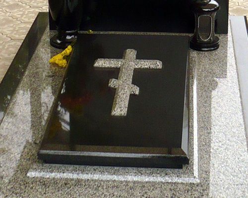 Изготовленная из гранита однотонная плита прямоугольной формы подходит для установки на могилу в сочетании с такого же цвета классическим памятником. Данная плита имеет вырез в форме православного шестиконечного креста в центре.